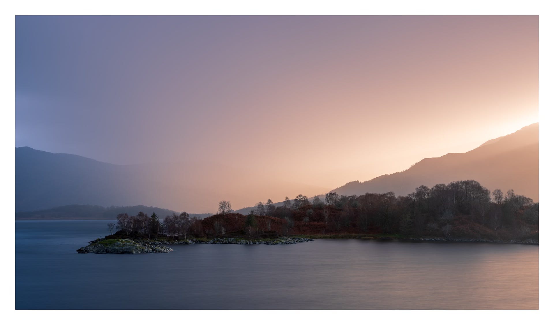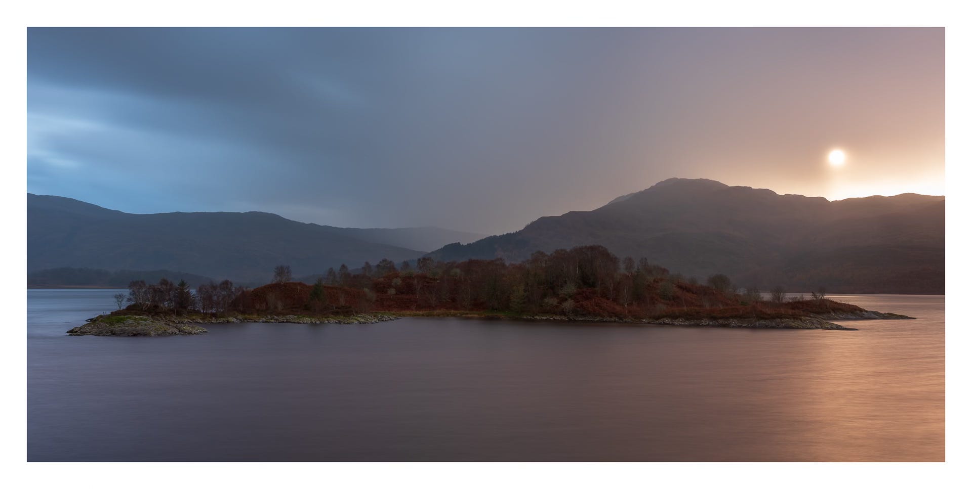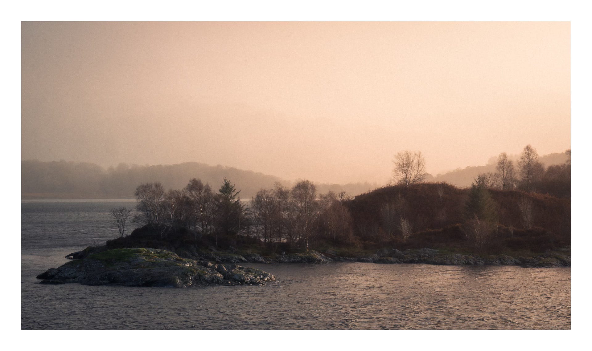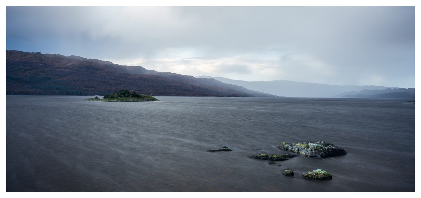 I decided against bringing the tripod, a decision I’m now regretting. I instead resort to balancing (or at least trying to) the GFX on the edge of one of the window ledges. I set up the familiar X-Pan aspect ratio and, with an ND filter applied, look to make a couple of images of the little islands out in the loch. I wish I had a slightly longer focal length. The wind at times is so strong that it rattles the hide like an angry bear looking to get in, rendering most of my attempts at making images a failure. Still, I think a few of them may have worked out, some even show the ferocity of the wind across the surface of the loch. Back to the van. Coffee on.