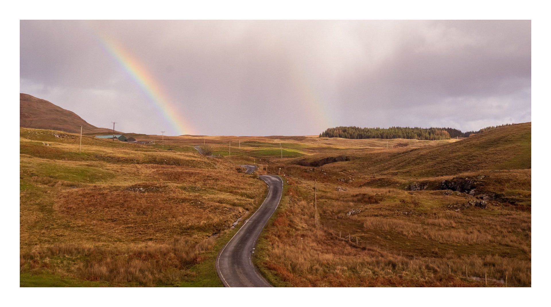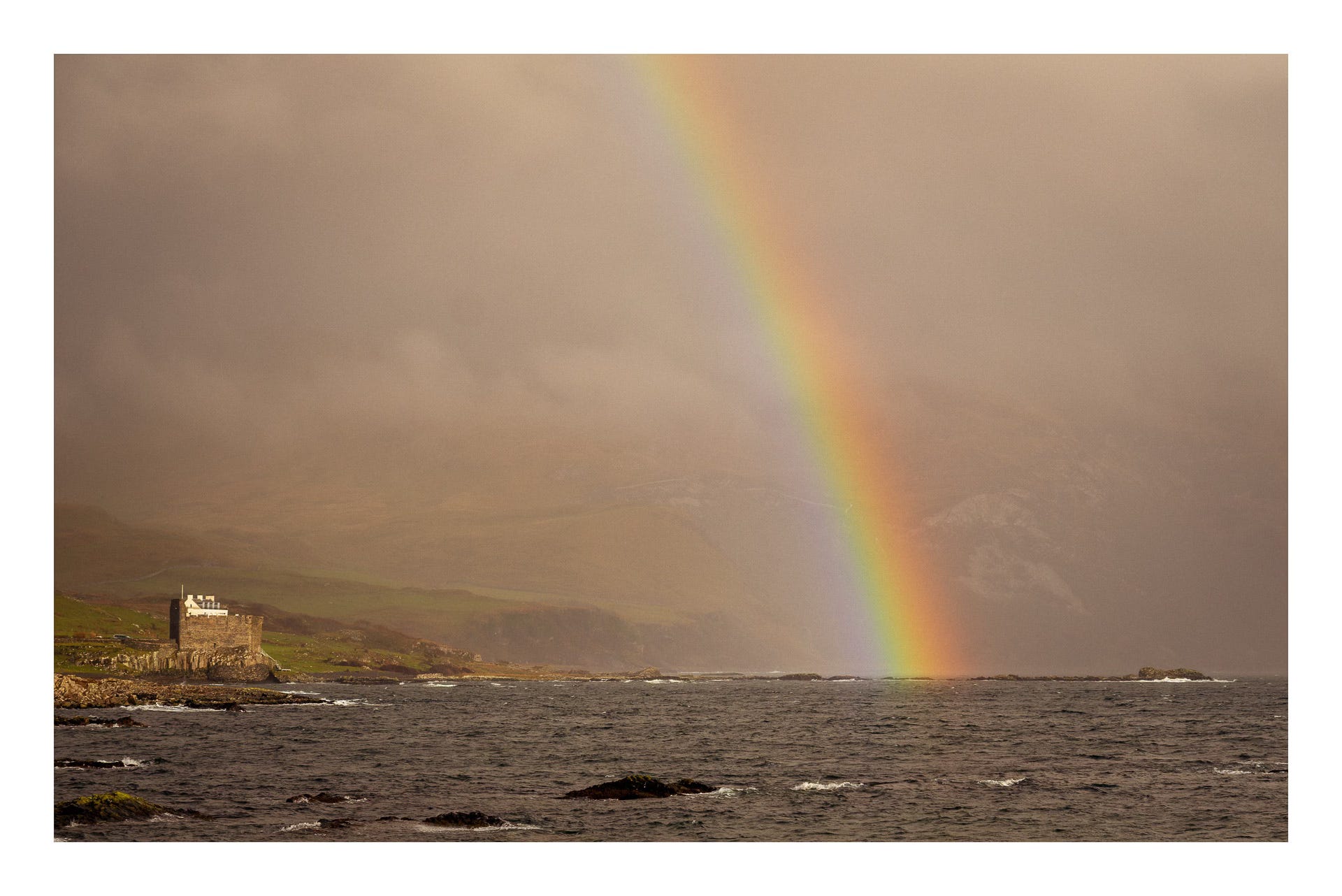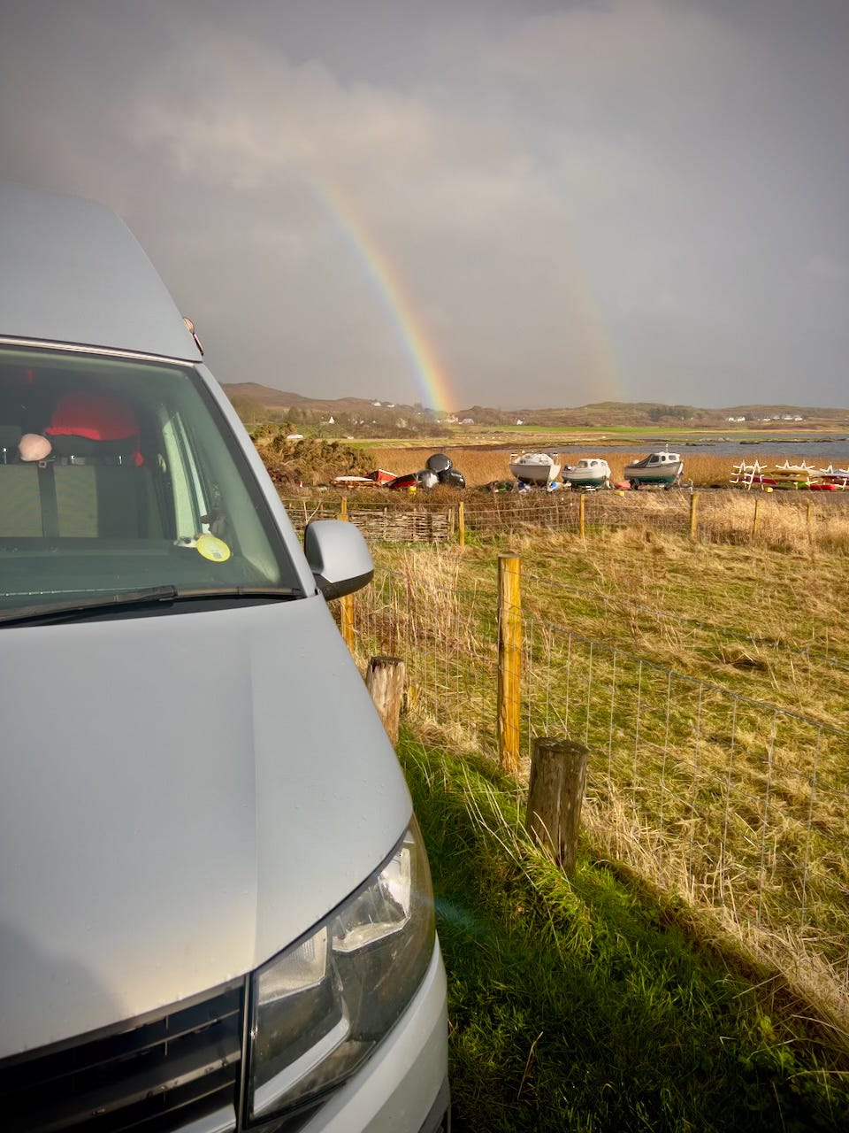 A quick stop in at the Ferry stores (their last day in business) to pick up a rather expensive tub of clotted cream. The perfect partner to some sour cherry jam we have. We are gifted a free pen for visiting on their last day. The owners are from Northern Ireland and we strike up a conversation, although my focus turns to the changing light outside. It’s incredible and we make a quick exit as the passing weather delivers rainbow after rainbow set against some of the most stunning storm light I’ve seen in a long time. It’s only a short drive down to our planned overnight stop, and yet by the time we arrive, the light has all but gone, replaced with dark, foreboding clouds. Soon the van is engulfed, and I cut a rather dejected figure as the rain batters down on the metal roof. Not even clotted cream can improve my mood.