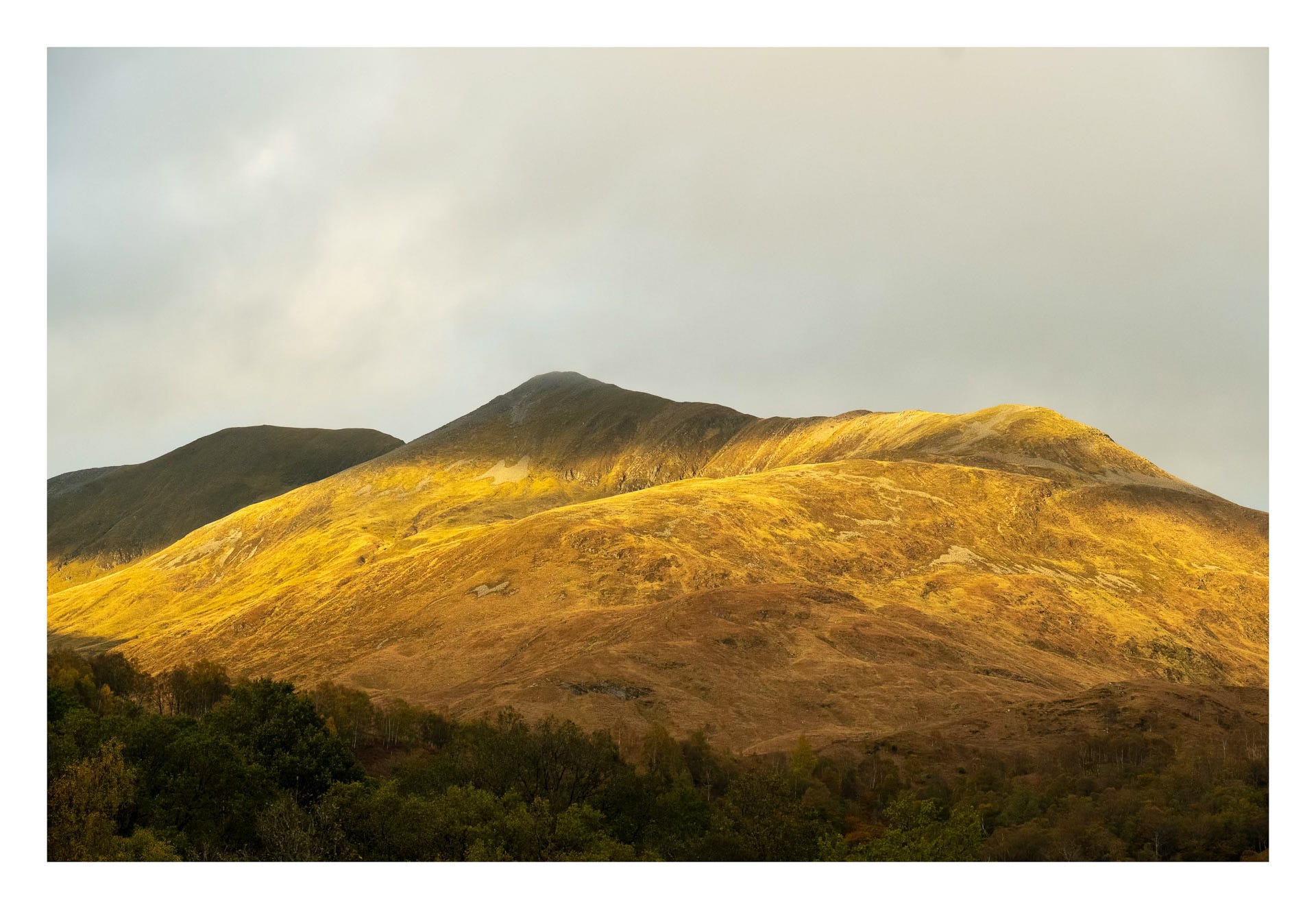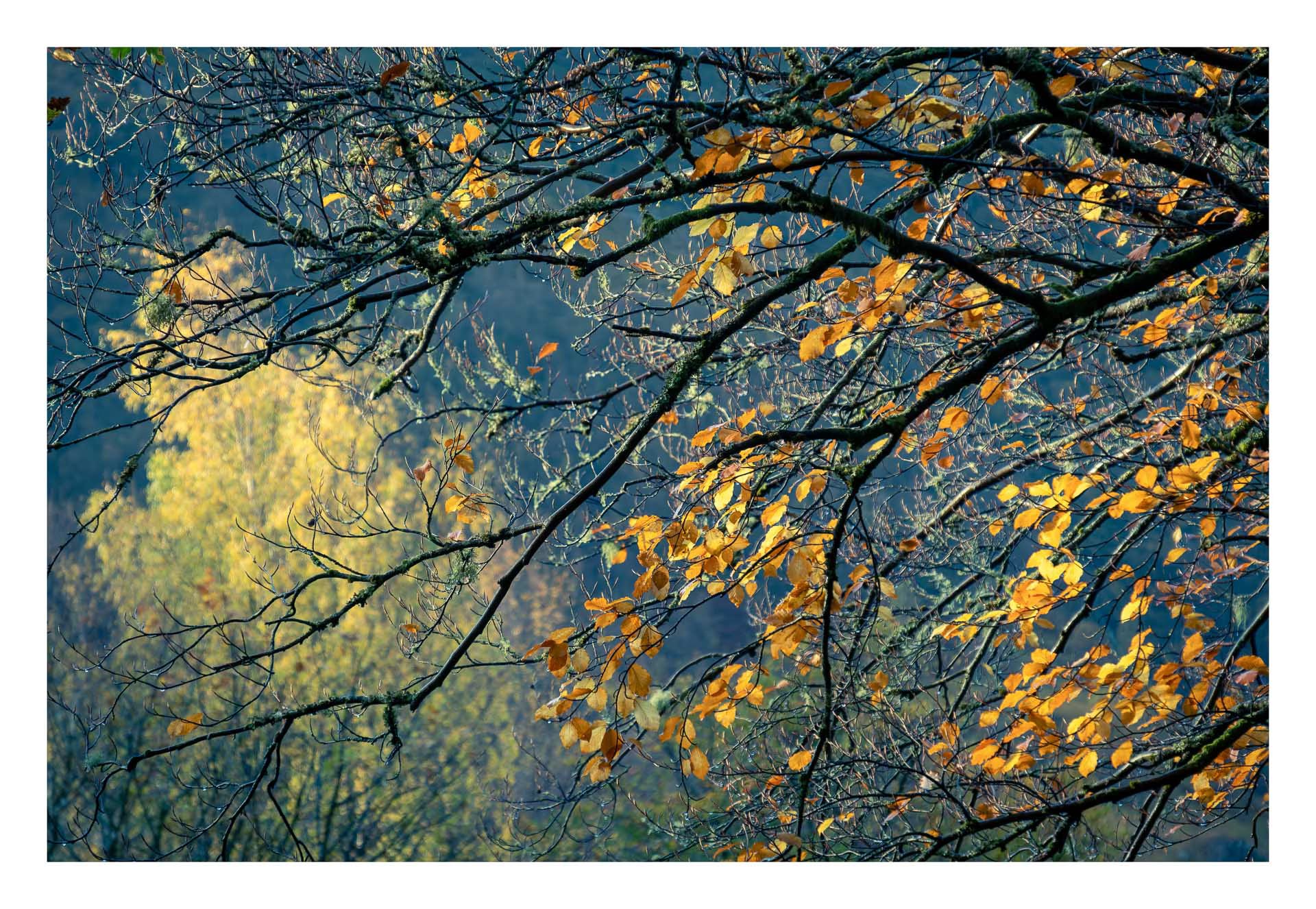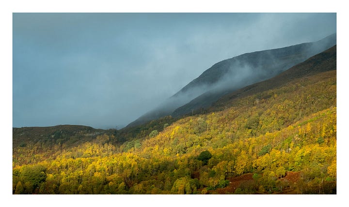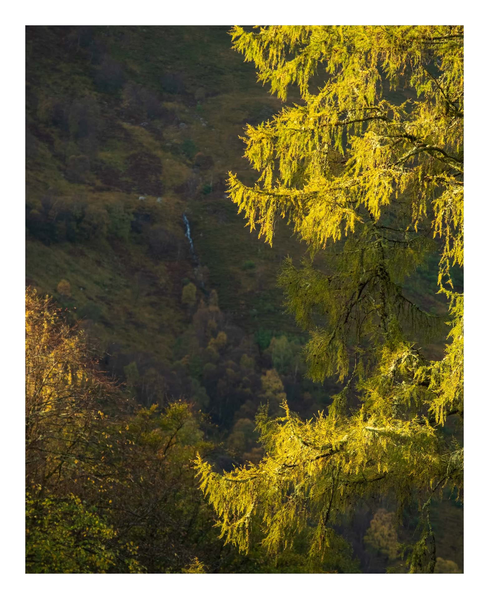 Two days of heavy rain had left the place rather sodden, but as the front moved through the sun was given permission to peek out from behind the clouds, bathing the mountainside in glorious golden light. Mist rising from the distant trees. Mixture of cold blues in the shadows and warm yellows where the sun was able to touch. My favourite mix of tones in photography.